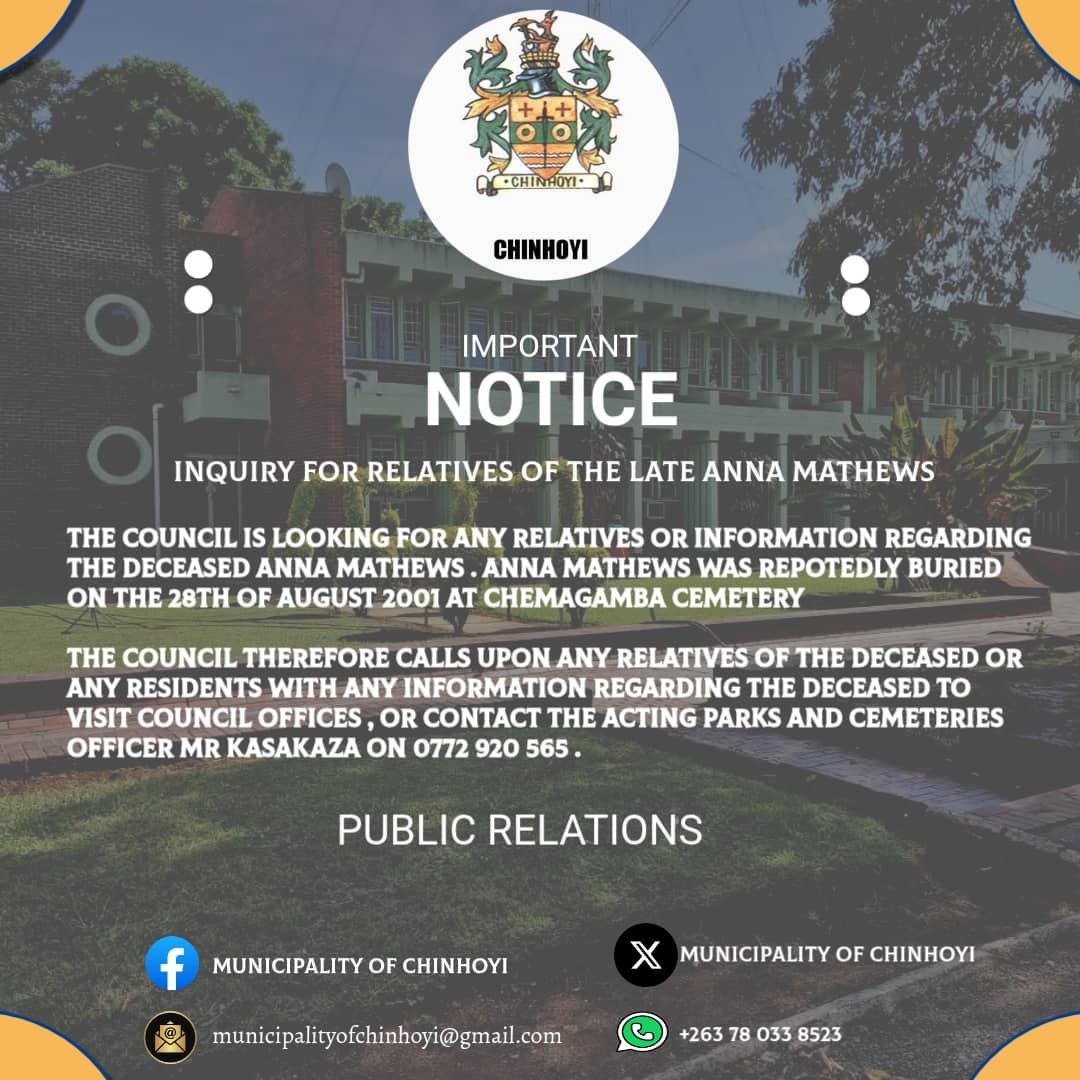 The Municipality of Chinhoyi is appealing to residents for any information or relatives of the late Anna Mathews, who was buried at Chemagamba Cemetery on 28 August 2001. If you can assist, kindly visit council offices or contact the Acting Parks and Cemeteries Officer, Mr. Kasakaza, at 0772 920 565.